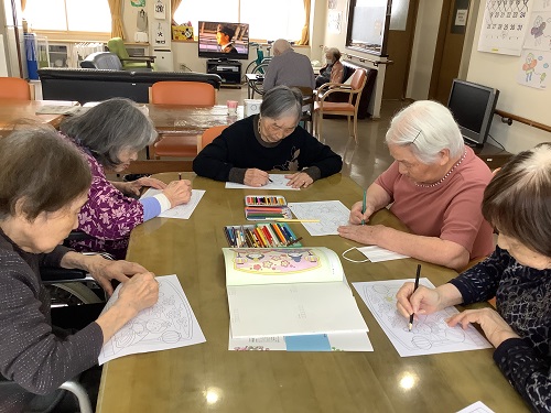 まだ寒い日は皆さんで塗り絵などしてたのしみます。
